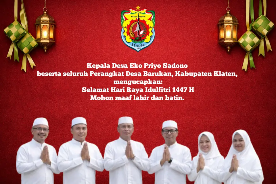 Dengan penuh keikhlasan, Kepala Desa Eko Priyo Sadono beserta seluruh Perangkat Desa Barukan mengucapkan selamat Hari Raya Idulfitri 1447 Hijriah. Mohon maaf lahir dan batin. Semoga kebahagiaan, kedamaian, dan keberkahan senantiasa menyertai seluruh masyarakat.